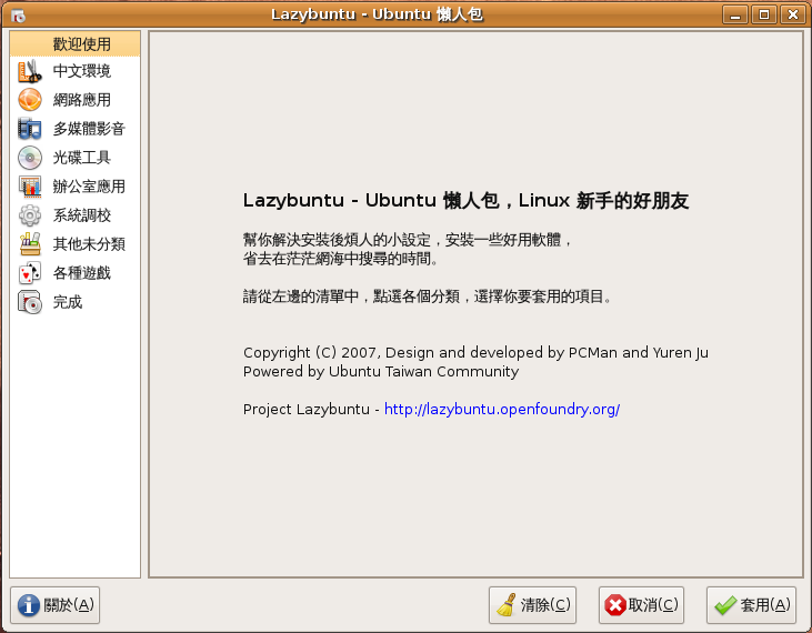 以上是官網對 Lazybuntu 的說明…Lazybuntu 讓許多東西的安裝變簡單了~