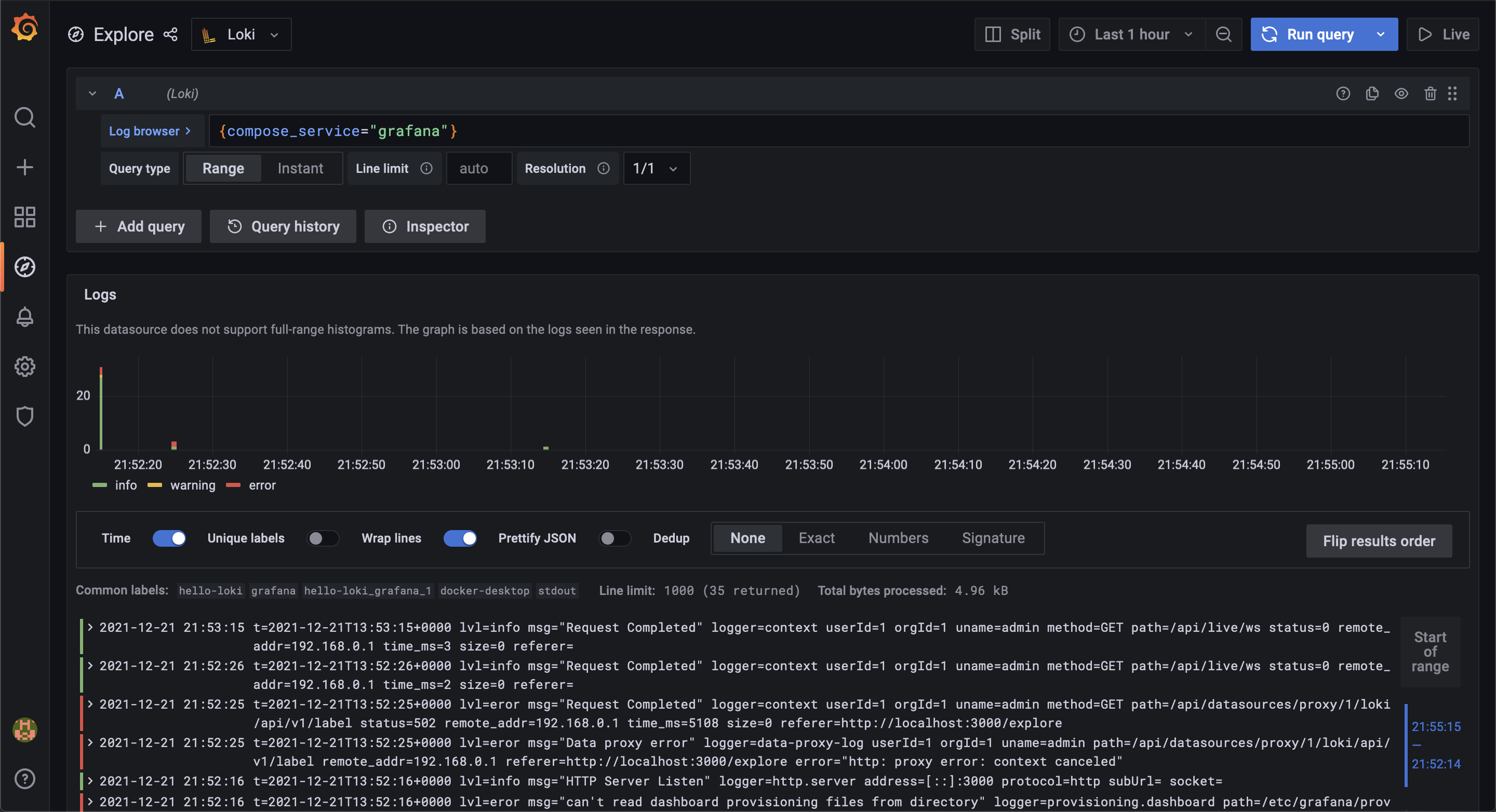 Loki,設定 URLhttp://loki:3100 - 打開 Explore,data source 選擇 Loki,就可以依照 label 查詢 log